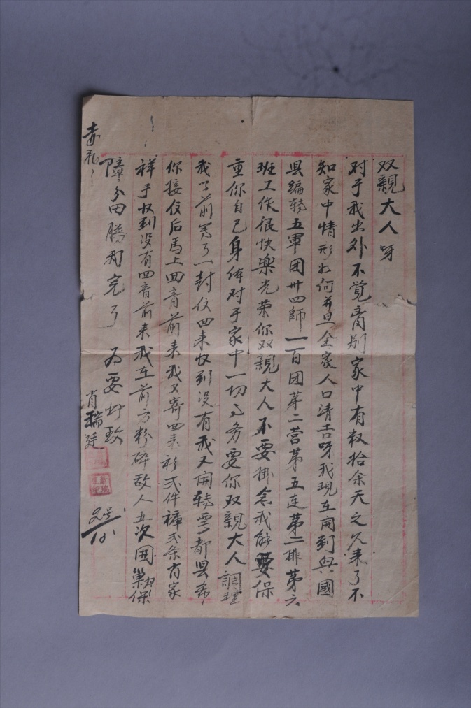 “双亲大人呀,对于我出外不觉离别家中有数十余天之久来了。”“你双亲大人不要挂念我,能要保重你自己身体,对于家中一切事务要你双亲大人调理。”“我又开转于都县,希你接信后马上回音前来。我又寄回来衫两件裤两条肖家祥手,收到没有回音前来。我在前方粉碎敌人五次‘围剿’,保障分田胜利。”