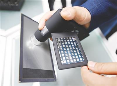 武汉国创科光电装备有限公司喷印装备“打印”制造出的显示面板样品,在放大镜下的效果。 (湖北日报通讯员 张璨龙 摄)