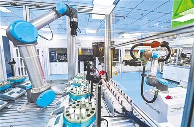 智化科技高度现代化的自动化合成实验室内,移动机器人正在取样品。 (湖北日报全媒记者 朱熙勇 摄)