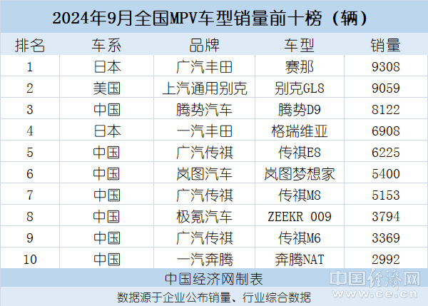 9月,MPV市场前十车型基本被丰田、别克、传祺与腾势四个品牌瓜分,四品牌销量合计占比接近80%。