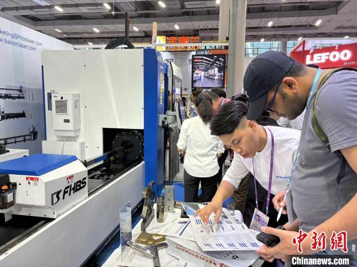 在加工机械设备展区,一款激光切割机吸引不少境外采购商围观,只见操作员将图纸上传系统后,不到2分钟,激光切割机就将一段钢管切割出设定的形状。