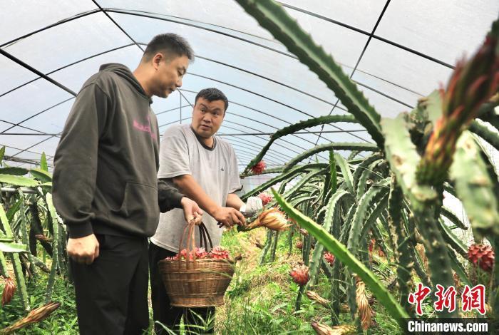 10月11日,成都市金堂县竹篙镇,顾客在李德平(右)的热带水果种植园采摘火龙果。记者 王磊 摄