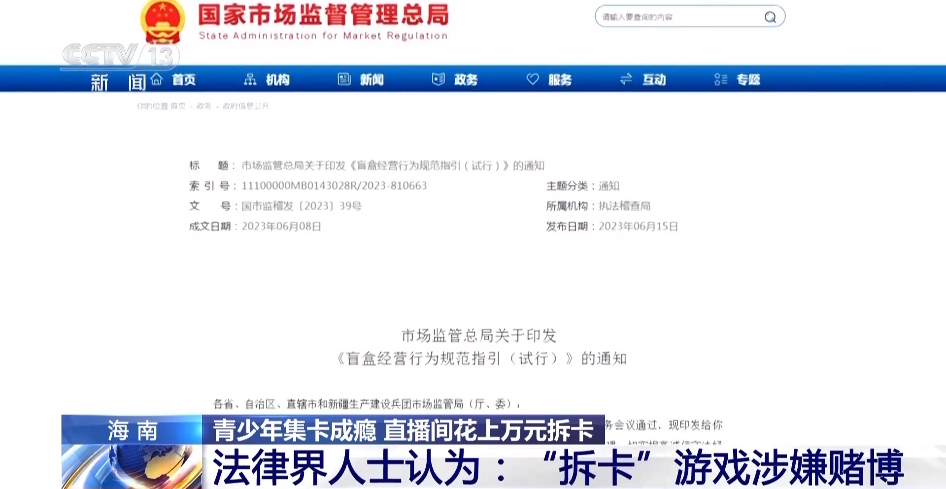 律师 李宇喆:如果当它具有付费投入,以及具有以小博大的不确定性,还有可变现产出这样的因素的时候,就可能涉嫌赌博这样的违法风险。同时,如果商家没有向消费者明确地公示,这个抽卡的概率以及规则,那么可能就侵害消费者的知情权和公平交易权。举个例子,如果商家在抽卡的时候抽出稀有卡,对它的概率进行夸大宣传,鼓励消费者进行“端盒”,那么这样的行为就是涉及到了虚假宣传。