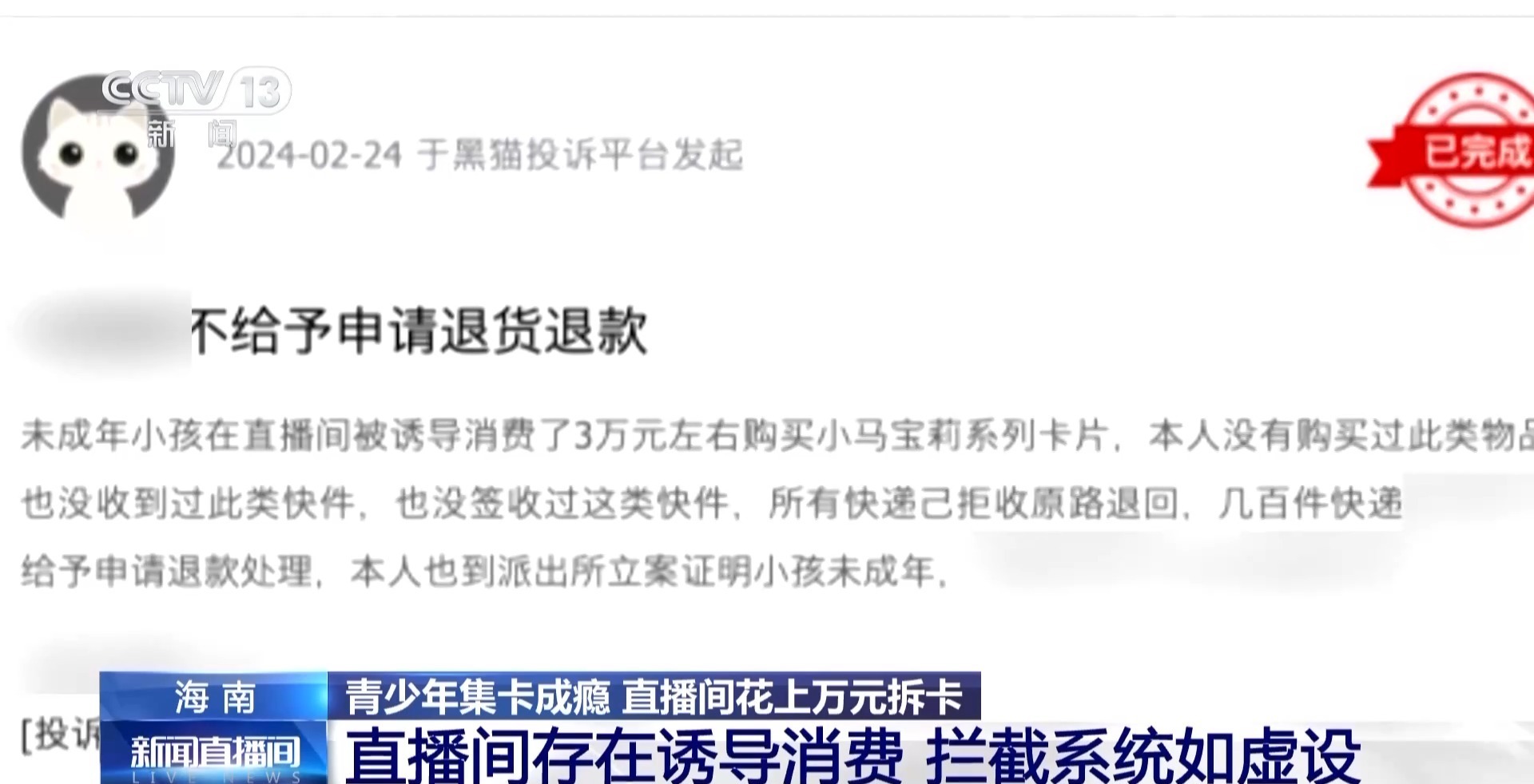 记者在一家投诉平台查询发现,今年以来,有不少家长发起投诉,称一些直播间诱导未成年人“拆卡”,并且拒绝退货退款,金额在几千到几万元不等。