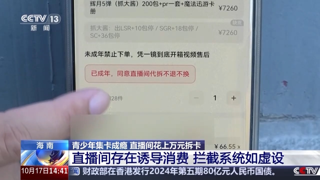 记者在一些平台的“拆卡”直播间发现,部分拆卡直播间存在捆绑销售、附赠式盲盒营销方式,诱导消费者进行非理性消费。