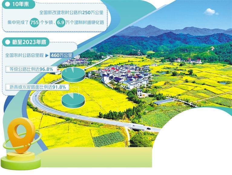 据统计,截至2023年底,全国农村公路总里程达460万公里,里程数可绕赤道115圈,等级公路比例达96.8%,沥青或水泥路面比例达91.8%,农村交通网络不断完善,有效打通了制约农村发展的交通瓶颈。