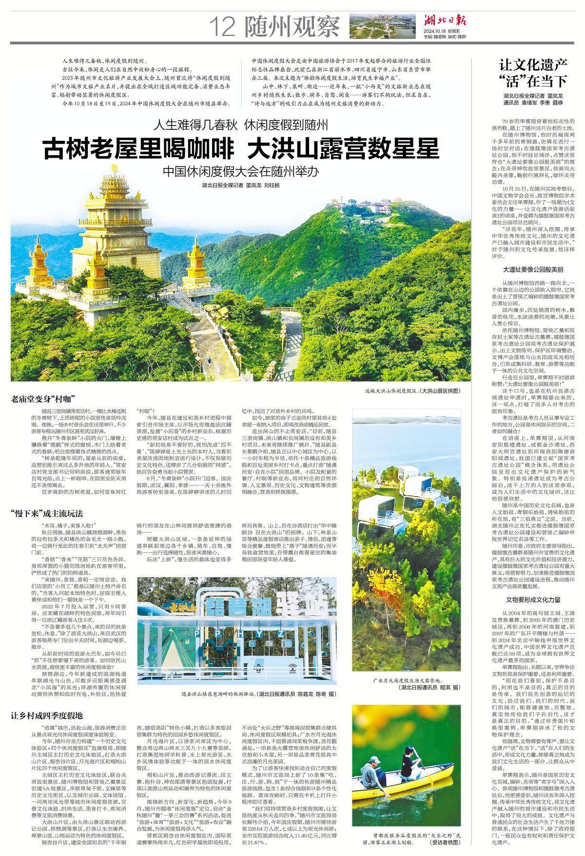 今年10月18日至19日,2024年中国休闲度假大会在随州市随县举办。中国休闲度假大会是由中国旅游协会于2017年发起举办的旅游行业全国性标志性品牌盛会,此前已在浙江省丽水市、四川省遂宁市、山东省东营市举办三届。本次主题为“体验休闲度假生活,培育民生幸福产业”。