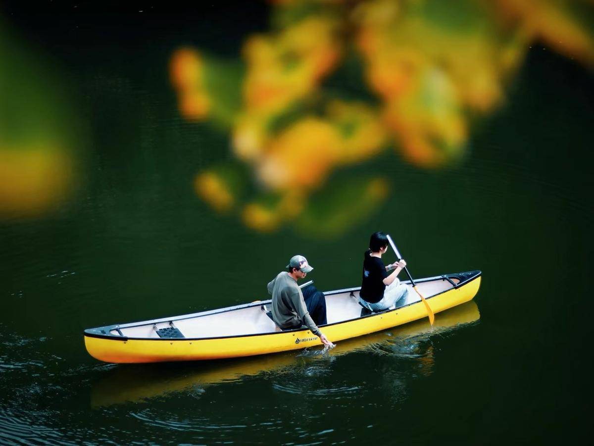 曾都区银杏谷度假区内的大乐之野民宿内,游客正在湖上划船。(受访者供图)