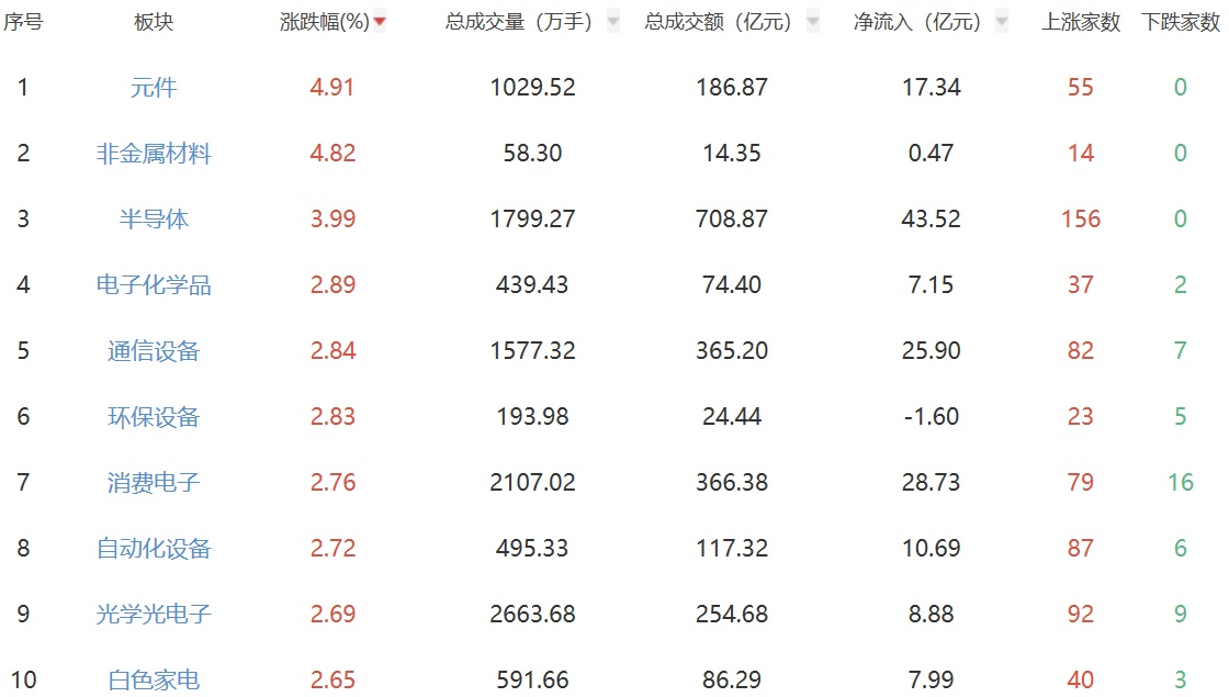 板块方面,元件、非金属材料、半导体板块涨幅居前,房地产、教育、银行板块跌幅居前。