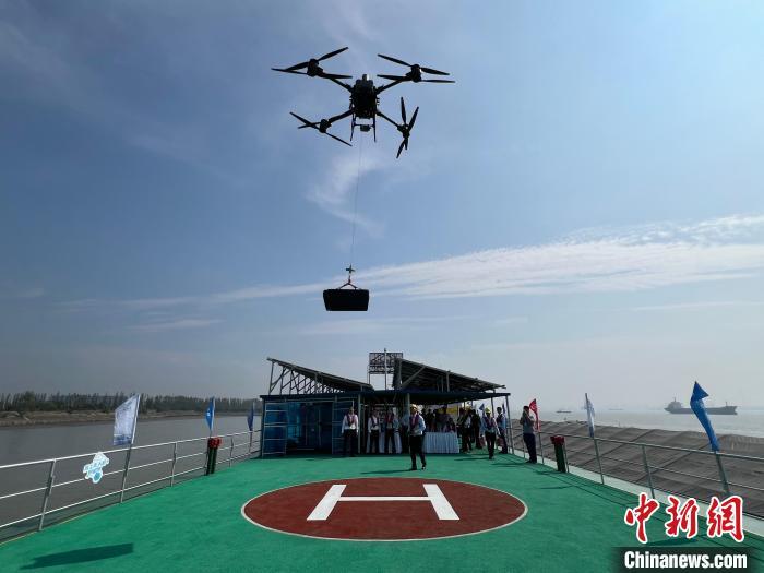 10月18日,江阴水上绿色综合服务区在长江下游江苏段揭牌并投产。无人机可将外卖直投配送至服务区,供船员领取。 中新社记者 朱晓颖 摄