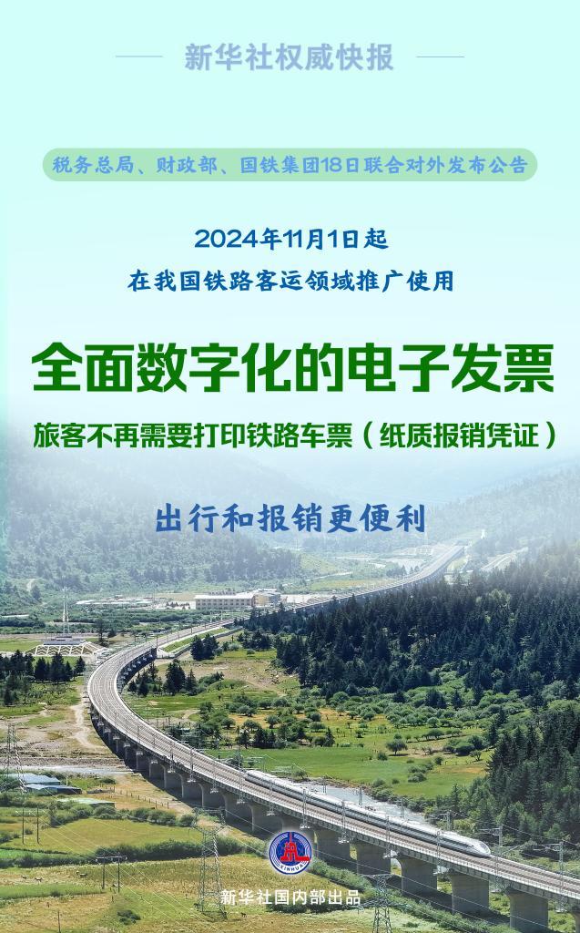 税务总局、财政部、国铁集团18日联合对外发布公告,自2024年11月1日起,在我国铁路客运领域推广使用全面数字化的电子发票——电子发票(铁路电子客票)。