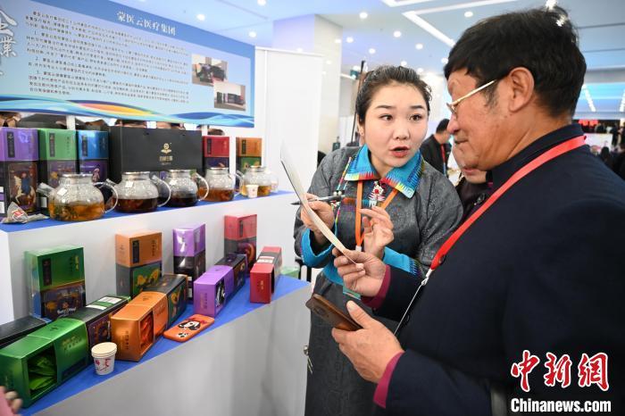 工作人员向客户介绍蒙医药产品“五行茶”。中新网记者 刘文华 摄