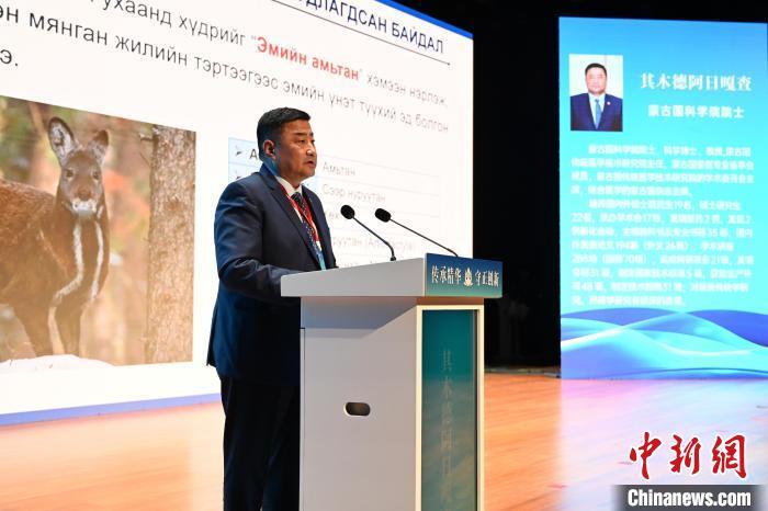 蒙古国科学院院士其木德阿日嘎查介绍该国草麝香的现状研究情况。中新网记者 刘文华 摄