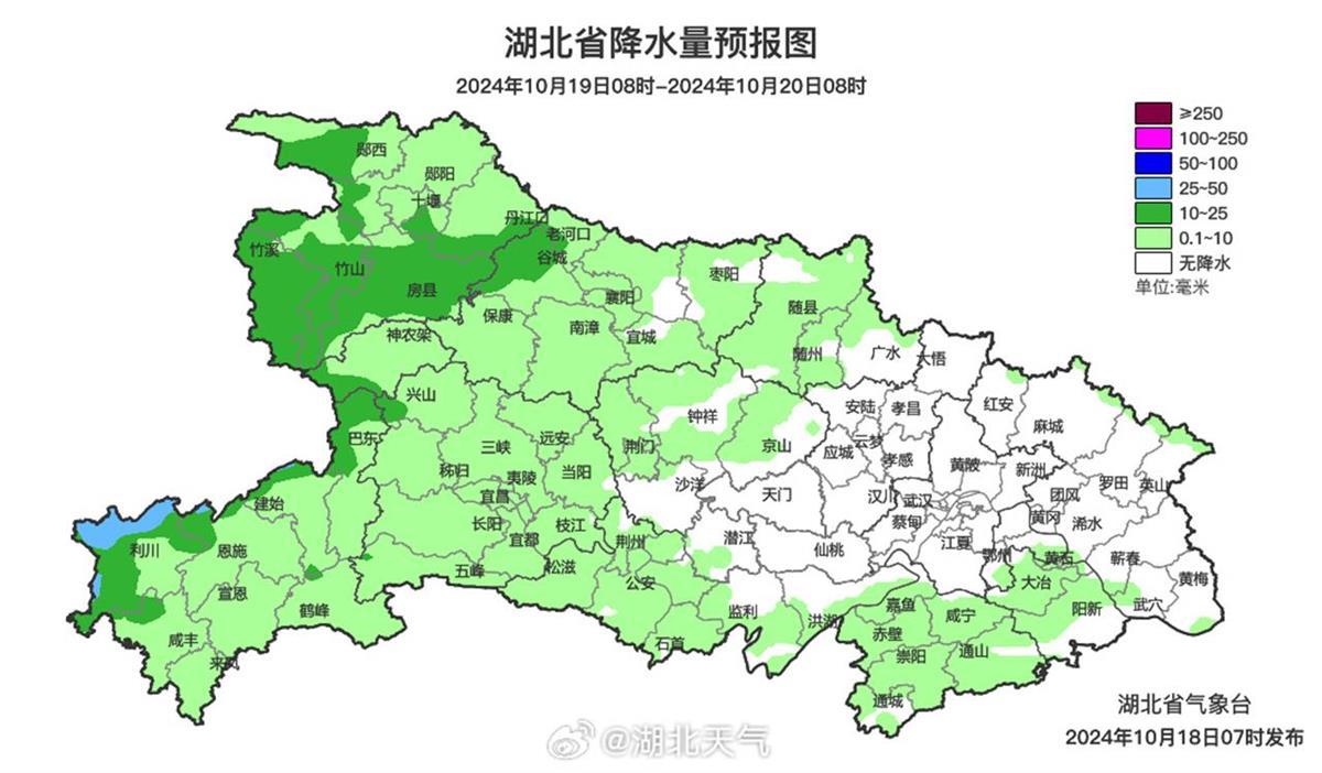 预计19日至21日(周六至下周一),湖北省自西向东有一次降水过程发生,全省小到中雨,局地大雨。