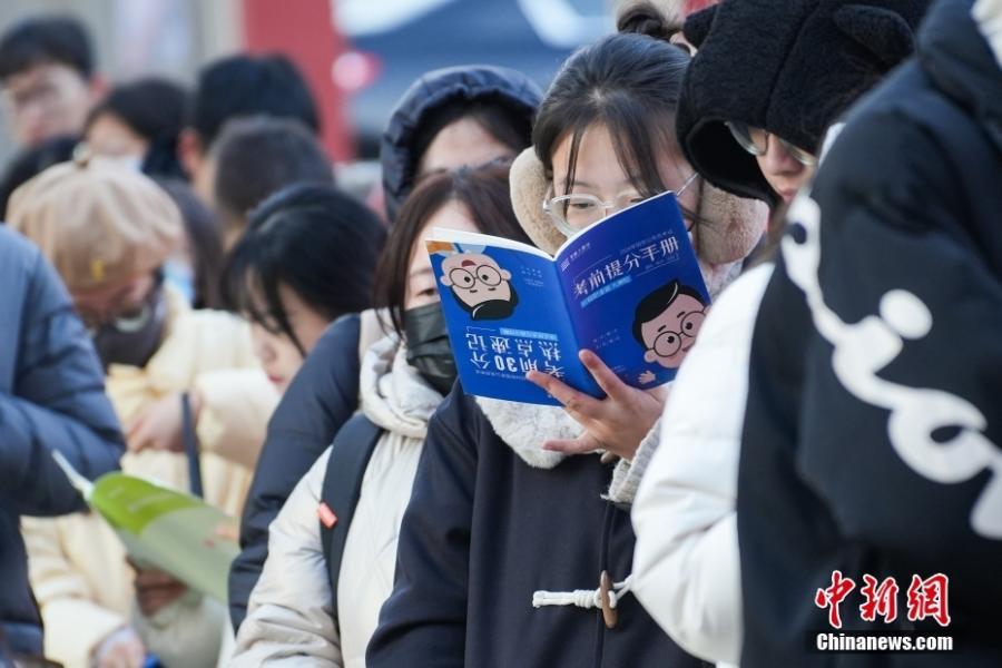 2023年11月26日,山西省太原市,考生在考场外复习。当日,中央机关及其直属机构2024年度考试录用公务员公共科目笔试举行。中新社记者 武俊杰 摄