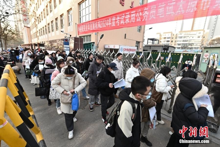 2023年11月26日,山西省太原市,考生步入考场。当日,中央机关及其直属机构2024年度考试录用公务员公共科目笔试开考。中新社记者 韦亮 摄