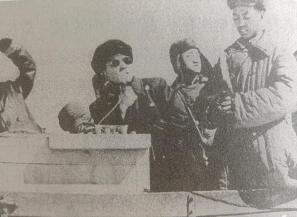 1951年,新疆航空队队员、时任空四师副师长袁彬在丹东浪头机场地面指挥车上指挥空战。