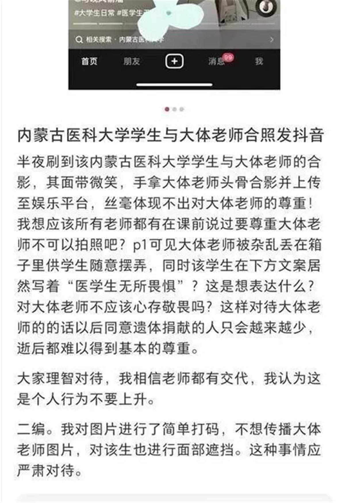 10月16日,内蒙古医科大学医学生在社交平台晒出几张与大体老师头骨的合影,引发网友不满。18日上午,该校基础医学院工作人员回应极目新闻记者,学校正在积极处理此事。(据10月18日极目新闻报道)