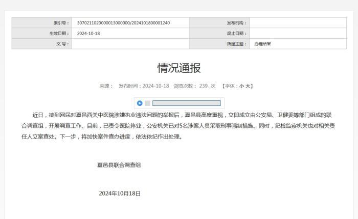 近日,接到网民对夏邑西关中医院涉嫌执业违法问题的举报后,夏邑县高度重视,立即成立由公安局、卫健委等部门组成的联合调查组,开展调查工作。