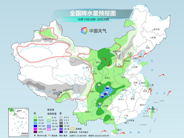 明天夜间到后天,内蒙古东部、黑龙江西北部等地部分地区有小雪或雨夹雪,内蒙古东北部、黑龙江西北部等地部分地区有中到大雪。