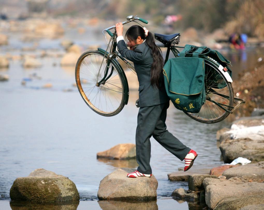 2007年1月6日,江西铅山县陈坊邮政代办所乡村邮递员罗细英扛着自行车过河。新华社记者 陈春园 摄