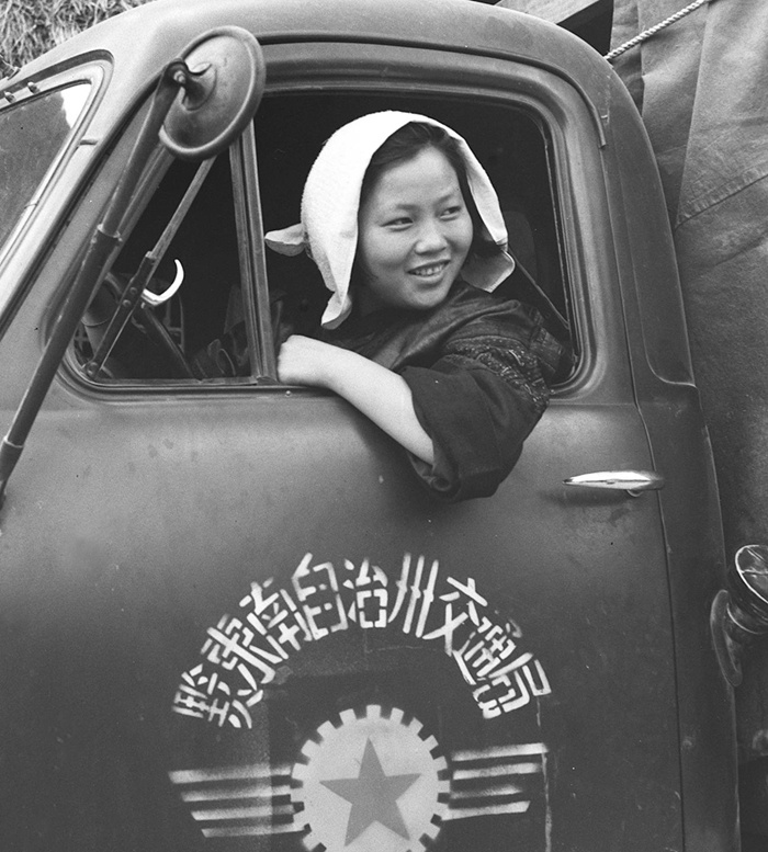 1959年8月22日,贵州黔东南苗族侗族自治州的林昌娥在驾驶运输车。新华社记者 王翼南 摄