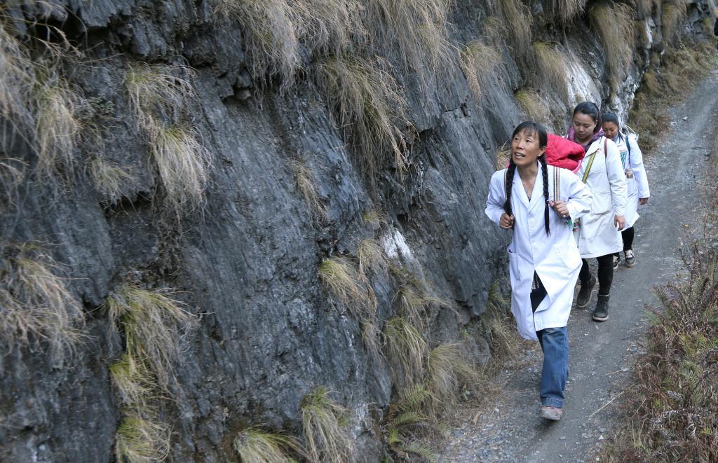 2019年1月13日,云南贡山县丙中洛镇“背篓医生”管延萍(左)与同事走在进村的山路上。新华社记者 张加扬 摄