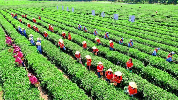 肖堰镇周湾村发展万亩茶园,游客正在体验采茶乐趣。