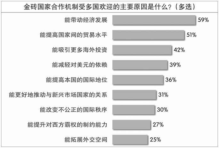 在12国受访者看来,金砖机制受多国欢迎的最主要原因是它“能带动经济发展”,有近六成受访者认同此原因。过半受访者认为,“能提高国家间的贸易水平”是金砖机制受欢迎的原因。此外,能“吸引更多海外投资”“减轻对美元的依赖”“提高本国国际地位”等原因也获得较多认同。王友明对《环球时报》记者分析说:“开放、包容、合作、共赢的精神是金砖国家能够走向‘大金砖’的根本原因,这四个要素缺一不可。”