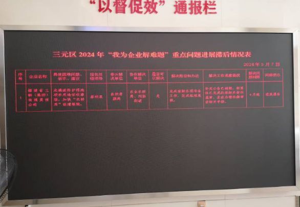2024年5月17日,三元区政府大楼一层大厅人流如织,墙上设置的“以督促效”通报栏所连接的大型LED电子屏格外引人注目。下午16:23,黑底红字的电子屏出现一条信息,内容为“三元区2024年‘我为企业解难题’重点问题进展滞后情况表”的公示,详细列出了所涉及的企业名称、所面临的难题、负责牵头解决的政府主管部门、未能在规定时间解决的原因、政府主管部门的公开承诺及解决措施,政府主管部门领导和区分管领导的名字也一一在列。不到一分钟,下午16:24,电子屏上随即又出现另一张被公开通报的表格。每天上班时间内,大厅内的这块电子屏都在不断更新信息,以此督促政府相关部门迅速解决企业遇到的难题。