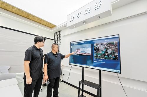 日前,雄安新区安新县赵北口镇李庄子村党支部书记曹建民(右)和雄安国创中心相关负责人,一起查看数字淀乡平台信息。记者 李 畅摄