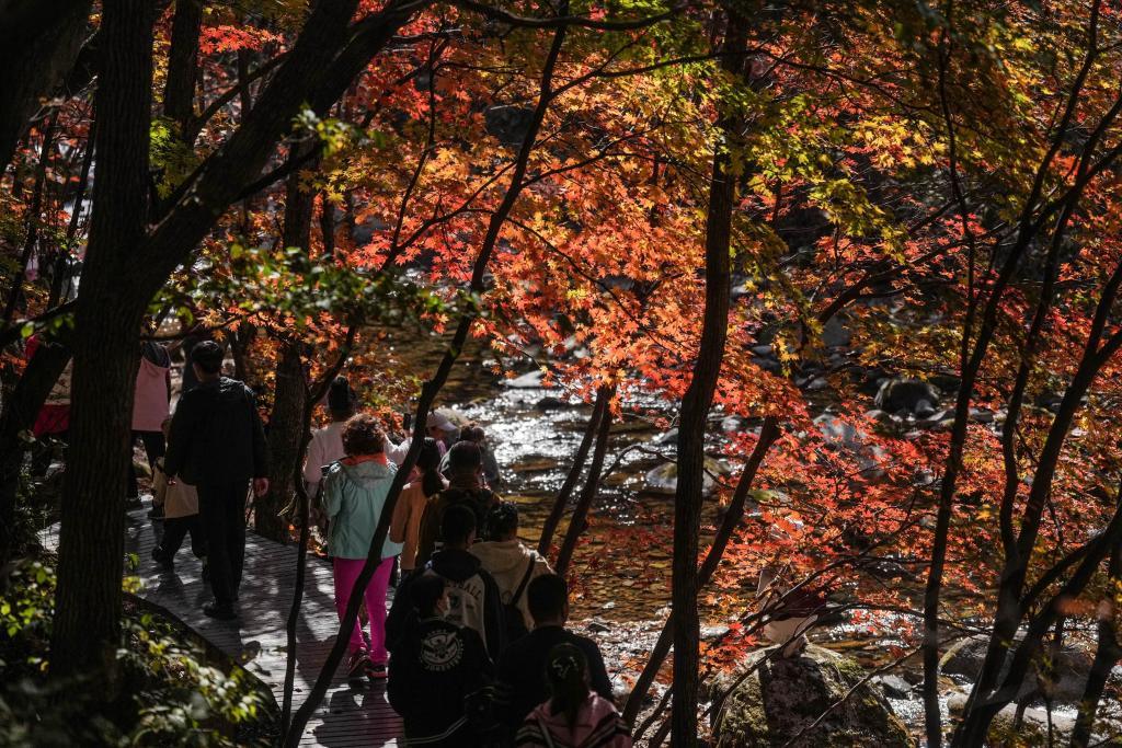 “这些年,本溪红枫打出了品牌,今年国庆假日期间,本溪累计接待游客量同比2023年增长43.49%;关门山国家森林公园日平均客流量近2万人次,吸引了大批省外游客,不少港澳台同胞及日本、韩国等外国游客也慕名前来赏枫。”关门山景区营销部经理李辉说。