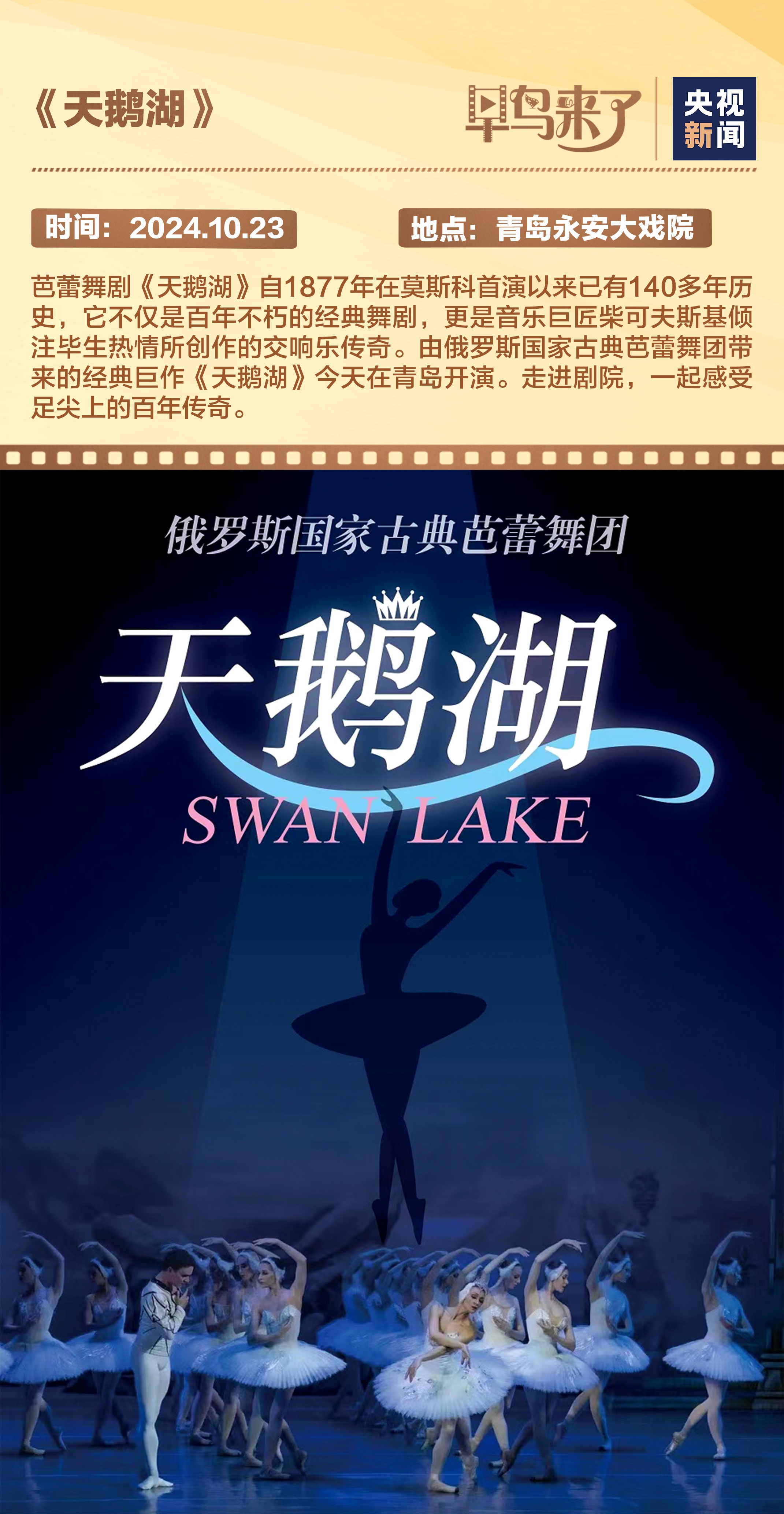 由俄罗斯国家古典芭蕾舞团带来的《天鹅湖》今天在山东青岛开演。演员们用轻盈的足尖,勾勒出一幅幅绝美的画面,每个动作都充满优雅与力量。走进剧场,感受这场脚尖上的梦幻传奇。