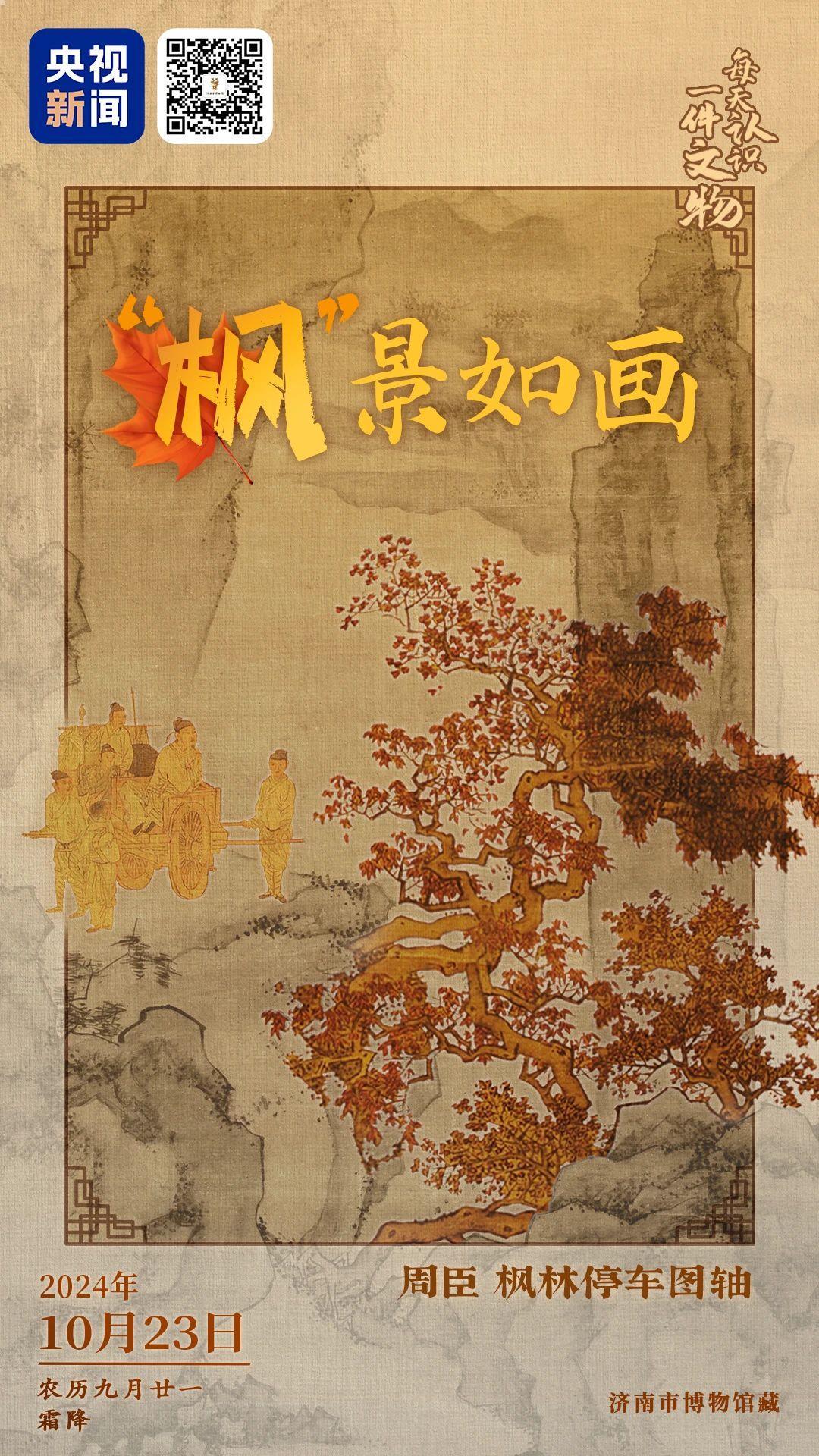 今日霜降,各地秋叶也开始“上红妆”了。《枫林停车图轴》由明代画家周臣根据唐代诗人杜牧的《山行》所作,画中最“吸睛”的两处莫过于:停车的众人和右侧巨大的枫树,隔着屏幕都能感受到,画中人物看到这棵枫树时的激动心情。