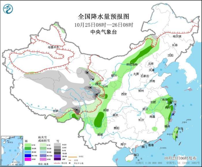 10月25日08时至26日08时,新疆西北部和南部、西藏北部和东部、青海东部和南部、甘肃西部、川西高原等地部分地区有小到中雪或雨夹雪,其中,西藏东部、青海东部、甘肃西部等地部分地区有大雪(5~8毫米)。内蒙古中南部、西藏东南部、四川盆地西南部、江苏南部、浙江东部、台湾岛东部等地部分地区有中到大雨,其中,浙江东部等地局地有暴雨或大暴雨(100~120毫米)。黑龙江东北部、青海西部等地部分地区有4~6级风,台湾海峡、巴士海峡、南海中东部部分海域将有8~10级、阵风11~12级的大风。