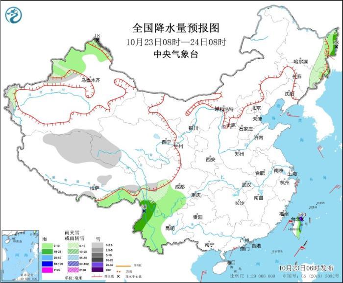 10月23日08时至24日08时,新疆阿勒泰山区和南疆西部山区、西藏北部和南部、青海西南部、吉林东部等地部分地区有小到中雪或雨夹雪,其中,新疆阿勒泰山区局地大到暴雪(10~18毫米)。黑龙江东北部、云南西部、台湾岛东部等地部分地区有中到大雨,其中,台湾岛东北部等地部分地区有暴雨或大暴雨(100~180毫米)。黑龙江东部、浙江东部等地部分地区有4-6级风。