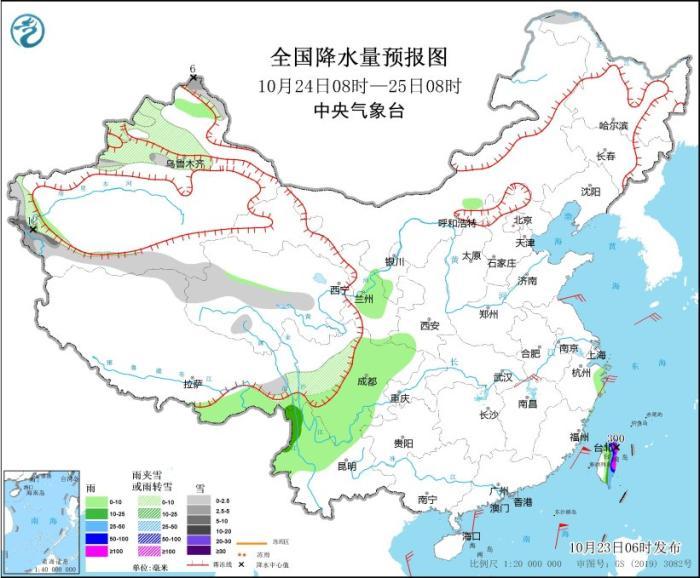 10月24日08时至25日08时,黑龙江西北部、新疆西北部和南部、西藏东南部和北部、青海西部、川西高原等地部分地区有小到中雪或雨夹雪,其中,新疆西北部和南疆西部山区等地部分地区有大到暴雪(10~12毫米)。四川盆地、云南西部和北部等地部分地区小到中雨,台湾岛东部等地部分地区有大到暴雨,局地有大暴雨或特大暴雨(250~300毫米)。湖北东部、浙江东部部分地区有4~5级风,台湾海峡、巴士海峡、南海东部、东海南部部分海域将有8~10级、阵风11~12级的大风。