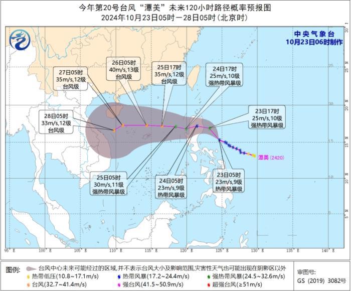 今年第20号台风“潭美”未来120小时路径概率预报图(10月23日05时-10月28日05时)