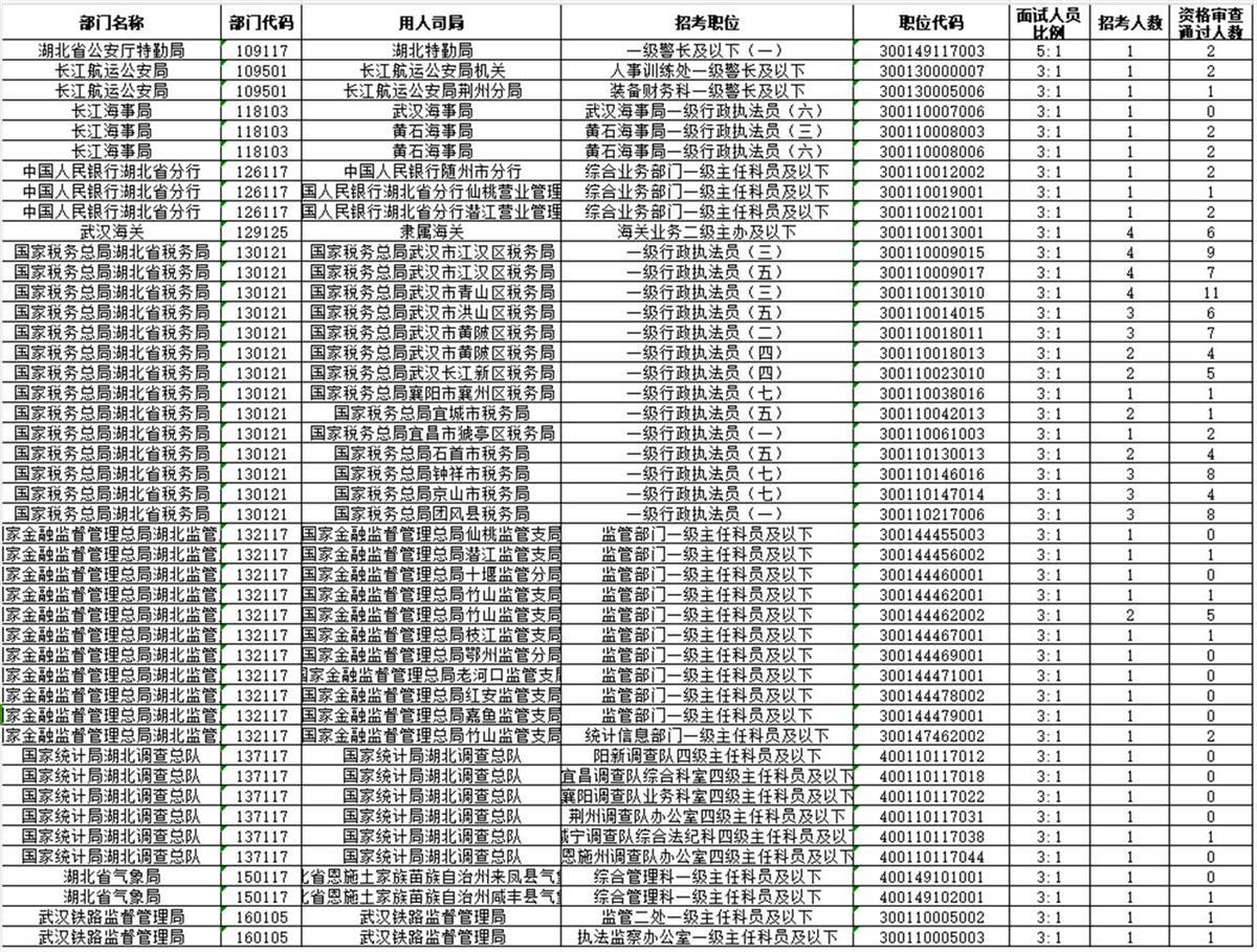 根据名单,湖北省公安厅特勤局拟招考1名一级警长及以下(一),该岗位面试人员比例为5:1,而截至22日该岗位资格审查通过人数仅2人。长江航运公安局机关拟招考1名人事训练处一级警长及以下,该岗位面试人员比例为3:1,截至22日该岗位资格审查通过人数仅2人。长江航运公安局荆州分局拟招考1名装备财务科一级警长及以下,该岗位面试人员比例为3:1,截至22日该岗位资格审查通过人数仅1人。武汉海事局拟招考1名一级行政执法员(六),该岗位面试人员比例为3:1,截至22日该岗位无人通过资格审查。黄石海事局拟招考1名一级行政执法员(三),该岗位面试人员比例为3:1,截至22日该岗位资格审查通过人数仅2人;黄石海事局拟招考1名一级行政执法员(六),该岗位面试人员比例为3:1,截至22日该岗位资格审查通过人数仅2人。武汉海关拟招考4名海关业务二级主办及以下,该岗位面试人员比例为3:1,截至22日该岗位资格审查通过人数仅6人。