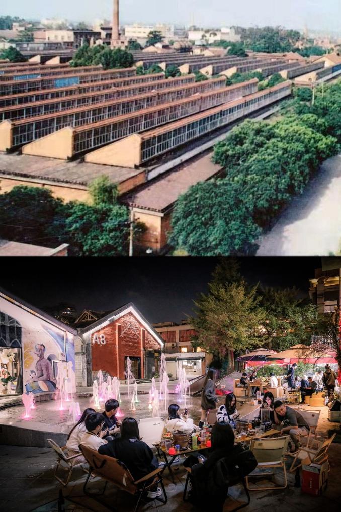 拼版照片:上图为原南宁市绢纺厂(资料图片);下图为经过改造后的百益上河城。