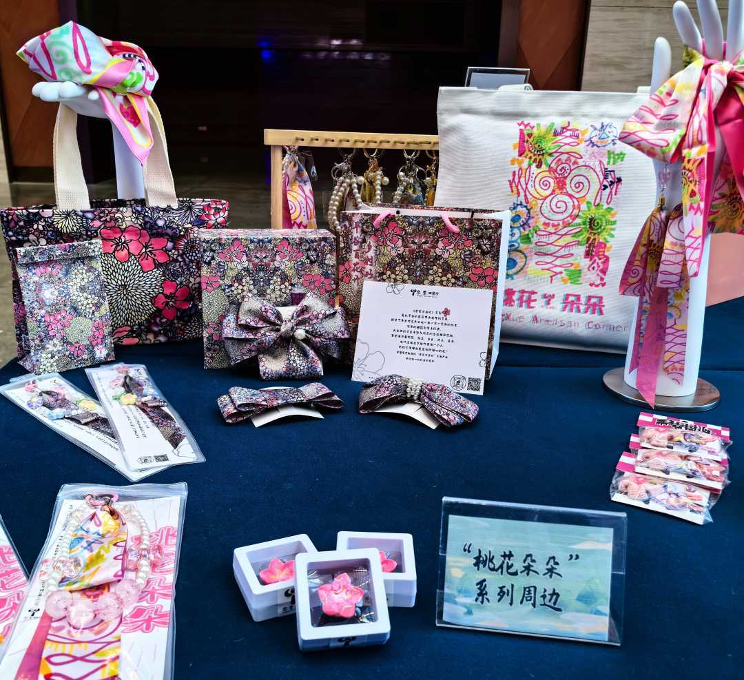 走进平谷区新平北路77号院最深处,一间不打眼但是布置别致的灰色房间内,隐藏着令人眼前一亮的粉色与紫色的世界。各式各样的时尚配饰,如胸针、头饰、丝巾、背包、马克杯、扇子,以及标志性的“吉电桃子”字样的布偶,共同构成了一个充满创意色彩的“桃文化”空间。