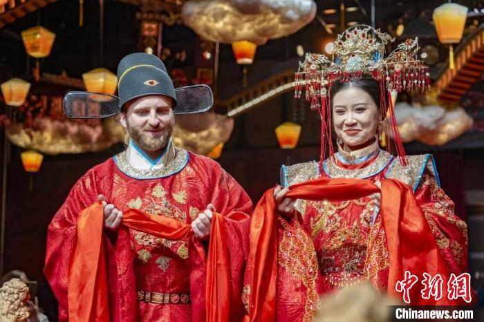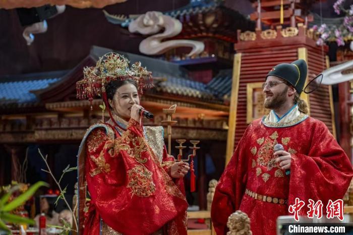 良辰美景,古乐悠扬,执事掌灯,赞者开礼,新人入堂。雨果身着红色圆领官袍,头戴礼帽,别具一番风味;赵敏身披凤冠霞帔,红妆点翠,大气端庄。经合卺之礼、鸾书凤笺、执手礼等一系列流程后,大婚礼成。现场,雨果和赵敏还一同献唱山西民歌《想亲亲》。