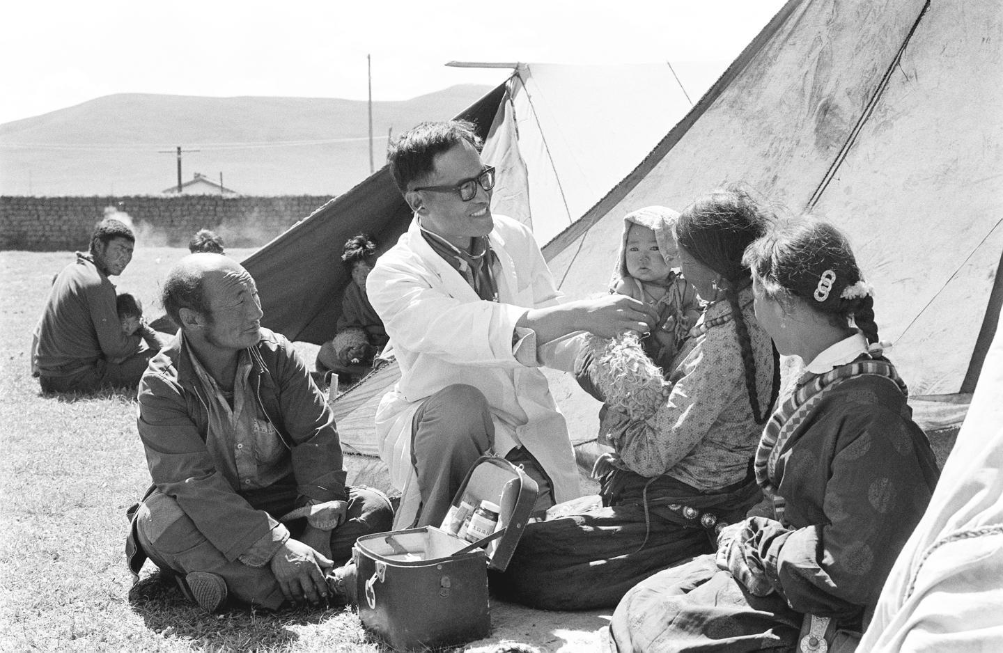 20世纪80年代,王万青(前排左二)给藏族群众看病(资料图片)。新华社记者张生贵 摄