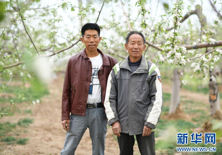 赵永东与儿子赵伟在自家果园合影。新华社记者 张博文 摄
