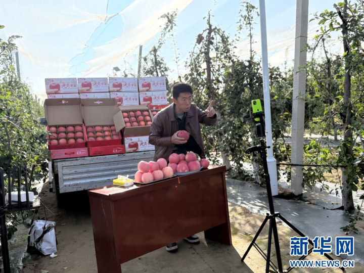赵伟在果园直播卖苹果。新华社记者 李梦婷 摄
