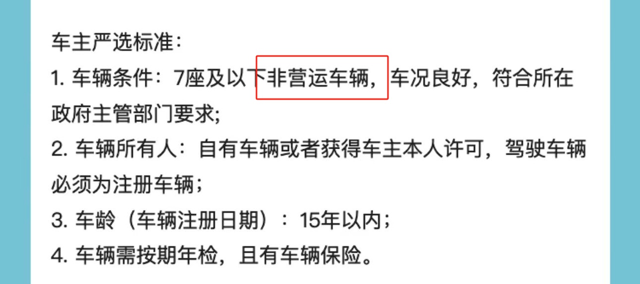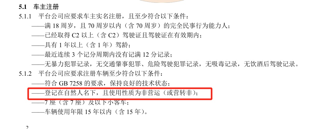 中国交通运输协会发布的《私人小客车合乘信息服务平台公司安全运行技术规范》中明确表示,平台公司应要求注册车辆符合登记在自然人名下,且使用性质为非运营(或营转非),该标准自2020年8月1日起实施。记者从嘀嗒出行APP“成为顺风车车主”规则一栏获悉,平台也明确规定注册顺风车车辆条件需为7座及以下非营运车辆,车辆良好,符合所在政府主管部门要求。