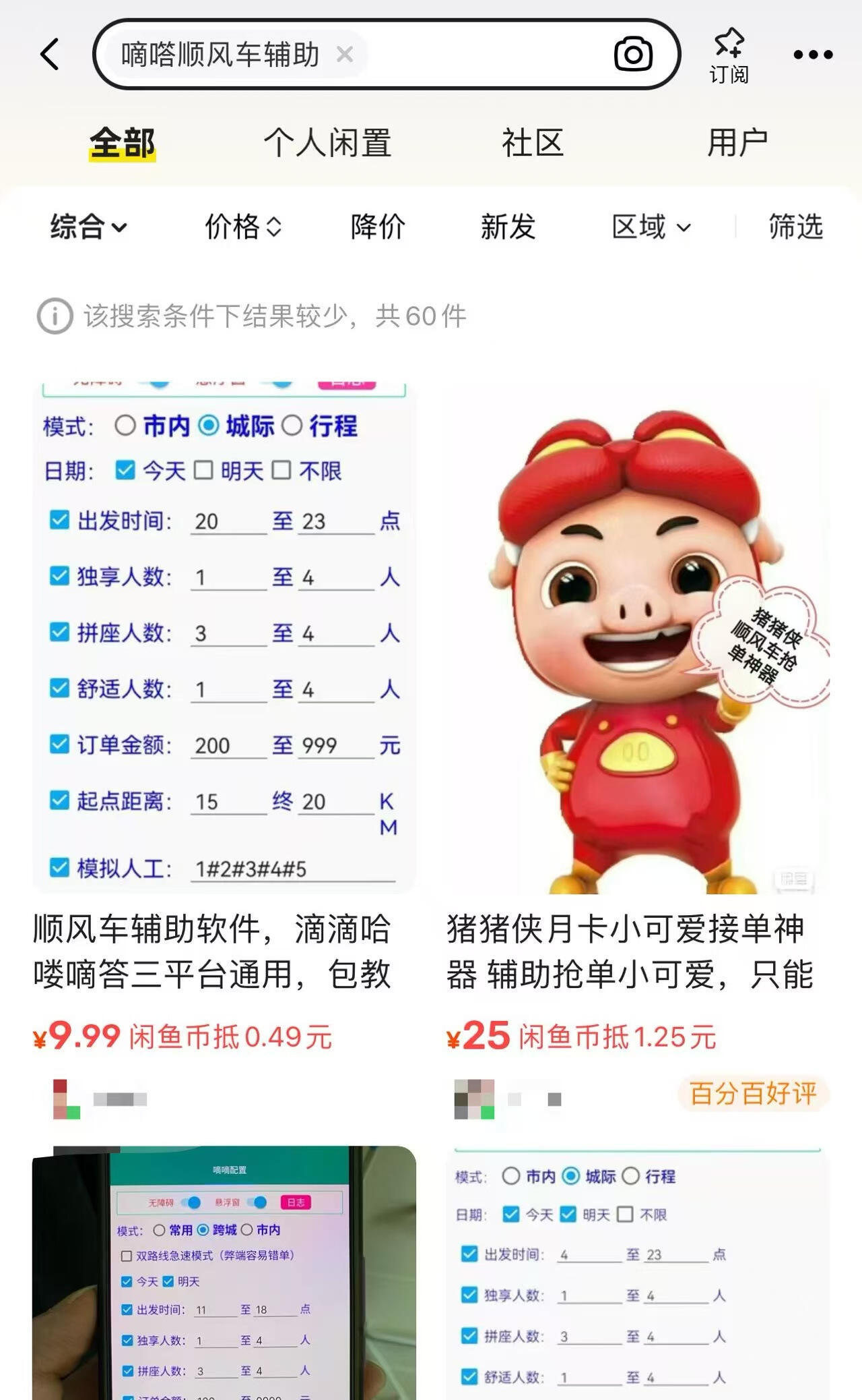 10月23日,记者打开“闲鱼”APP,搜索关键词“嘀嗒顺风车”,便自动弹出“嘀嗒顺风车辅助”等相关词条,类似于这类顺风车平台的线上抢单外挂屡见不鲜。