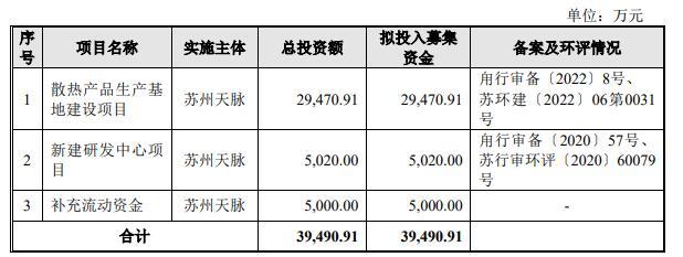 公司最终募集资金净额比原计划多15001.71万元。2024年10月21日,苏州天脉发布的首次公开发行股票并在创业板上市招股说明书显示,公司拟募集资金39,490.91万元,用于散热产品生产基地建设项目、新建研发中心项目、补充流动资金。