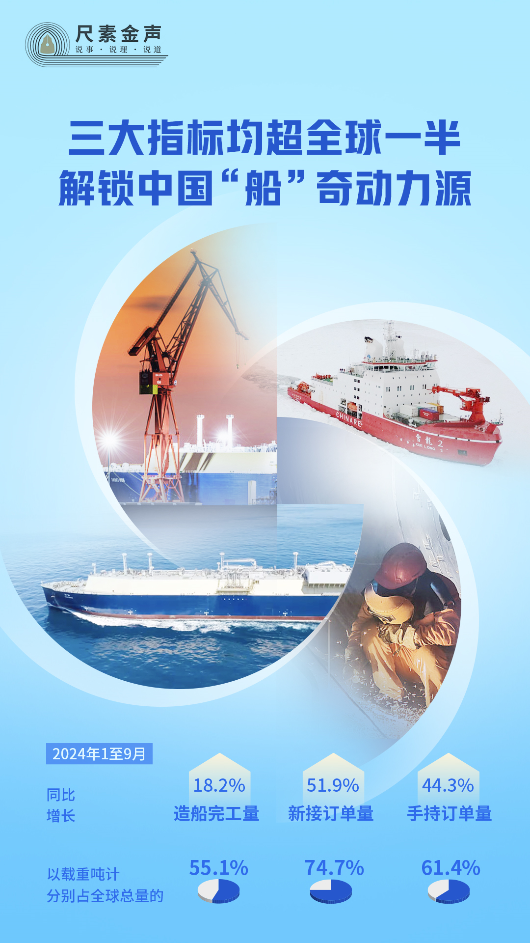日前,2024年前三季度造船业成绩单发布:1至9月,我国造船完工量、新接订单量、手持订单量分别同比增长18.2%、51.9%、44.3%,以载重吨计,分别占全球总量的55.1%、74.7%和61.4%。