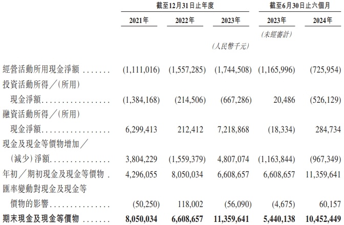 2021年、2022年、2023年和2024年1-6月,地平线机器人的经营现金流出净额分别为11.11亿元、15.57亿元、17.45亿元和7.26亿元。